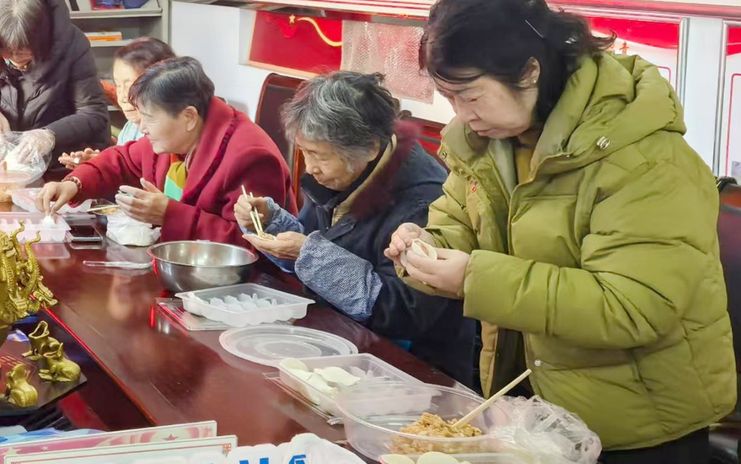 老年居民們滿懷興奮與期待,早早來到現場圍坐在一起,分工明確、配合默契。大家有條不紊地進行著和面、搟皮、包餡等環節。現場氣氛熱烈融洽,大家一邊包餃子,一邊愉快聊天,分享生活趣事和包餃子技巧。有的居民手法嫻熟,搟出的餃子皮又薄又圓;有的創意無限,包出的餃子形態各異,像飽滿的元寶,寓意財富好運;像小巧的貝殼,精致可愛;還有像綻放的花朵、活潑的小動物,充滿童趣與創意,引得大家歡笑贊嘆。