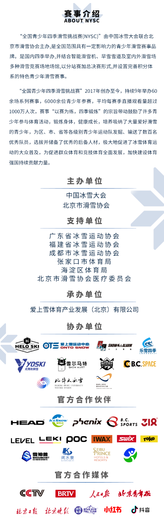 據(jù)介紹,“全國(guó)青少年四季滑雪挑戰(zhàn)賽”2025賽季聯(lián)合壹零叁壹體育產(chǎn)業(yè)發(fā)展有限公司、北京樂(lè)雪飛揚(yáng)體育文化有限公司、十萬(wàn)雪極(北京)體育文化有限公司、博雅升(北京)體育文化有限公司、成都尤斯卡體育文化傳播有限公司、深圳市雪爾馬特企業(yè)發(fā)展有限公司、上海輕樂(lè)娛科技有限公司廈門分公司、北京雪浪斯巴達(dá)體育文化有限公司、南京邊城體育用品銷售有限公司、北體大冰雪運(yùn)動(dòng)運(yùn)營(yíng)管理(北京)有限公司、張家口興垣體文旅運(yùn)營(yíng)管理有限公司旗下的優(yōu)質(zhì)場(chǎng)館,為參賽選手打造專業(yè)、安全的競(jìng)賽場(chǎng)地,配備國(guó)內(nèi)專業(yè)技術(shù)官員及裁判員全力保障賽事公平公正,由北京市滑雪協(xié)會(huì)醫(yī)療委員會(huì)特派曾參與冬奧保障的滑雪醫(yī)生現(xiàn)場(chǎng)保障,為賽事的安全舉辦保駕護(hù)航。同時(shí)賽事得到2025官方合作伙伴HEAD、航天愛思諾、Phenix、邊城體育、IWAX、LEVEL、LEKI、POC、SWIX、TOKO、318、雪神獸、炁運(yùn)動(dòng)香薰、春及運(yùn)動(dòng)康復(fù)中心的全年助力。