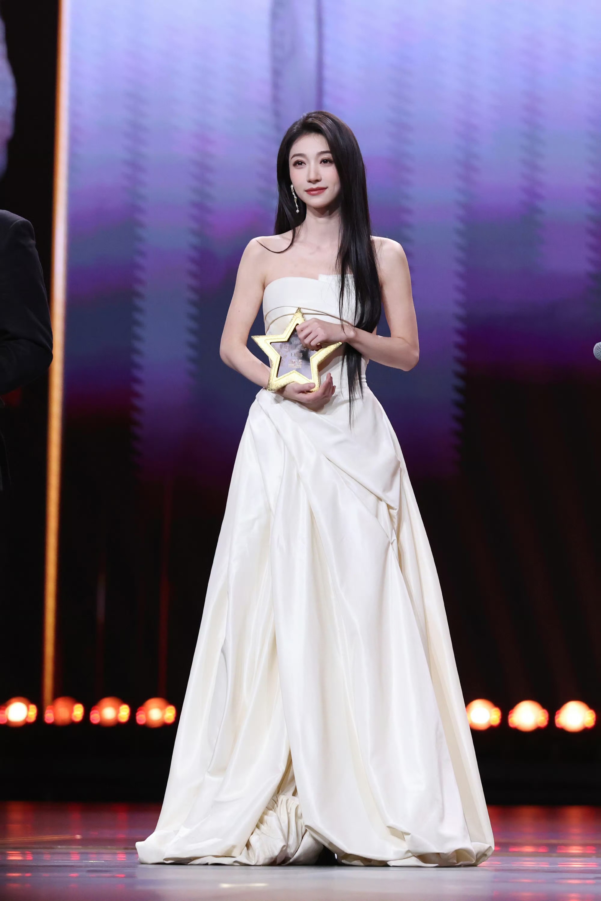 反倒是內場,將頭發散下來,然后穿一條白色的長款連衣裙,更加的還原自身的氣質。