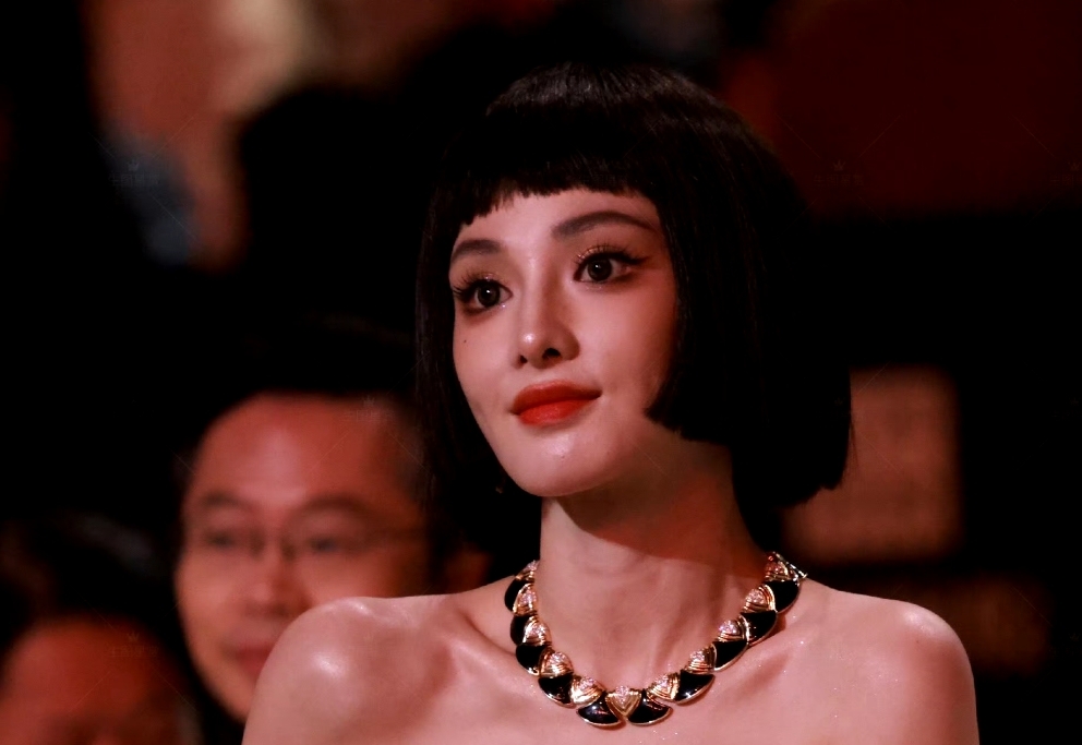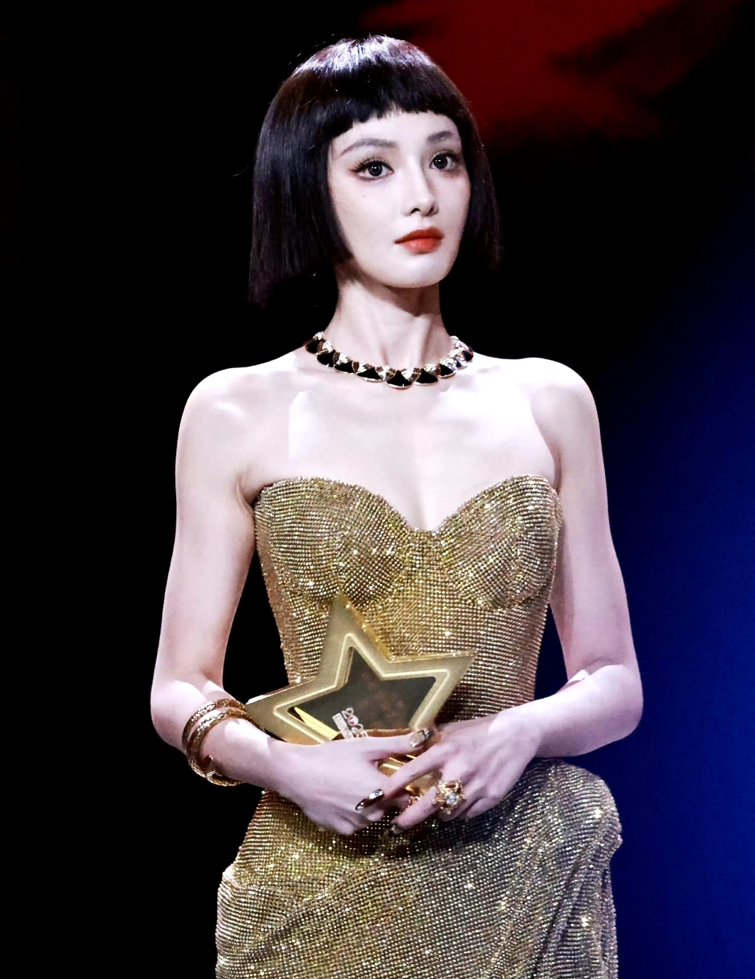 這一次罕見的參加了紅毯的活動,搭配一條金色的抹胸連衣裙,生圖狀態非常的好。
