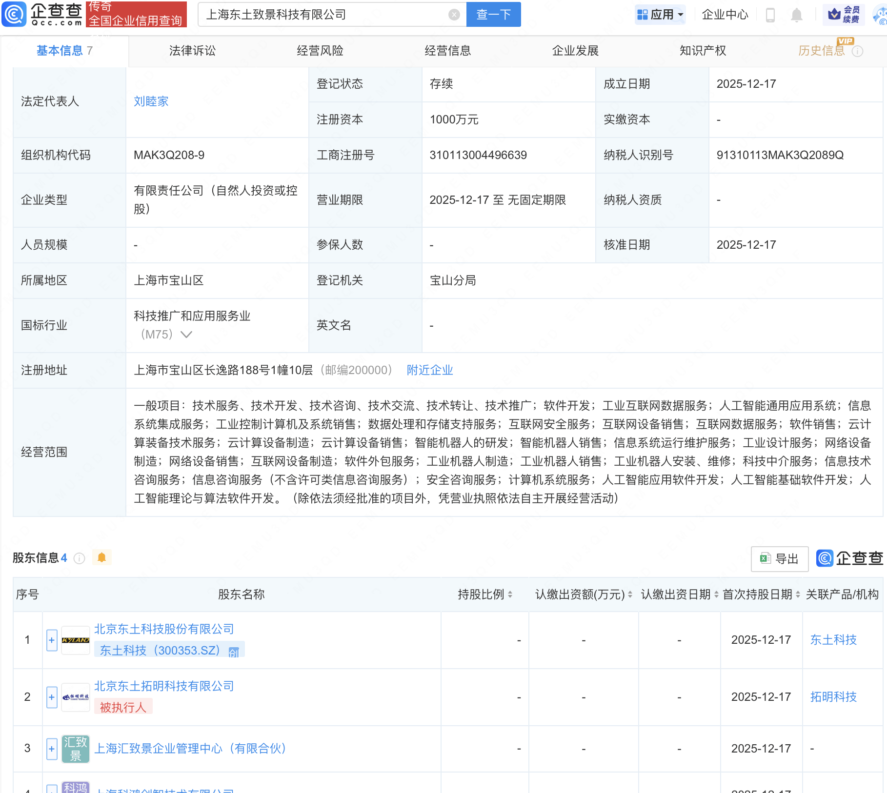 企查查APP顯示,近日,上海東土致景科技有限公司成立,注冊資本1000萬元,經營范圍包含:智能機器人的研發;智能機器人銷售;人工智能應用軟件開發;人工智能基礎軟件開發;人工智能理論與算法軟件開發等。企查查股權穿透顯示,該公司由東土科技(300353)等共同持股。