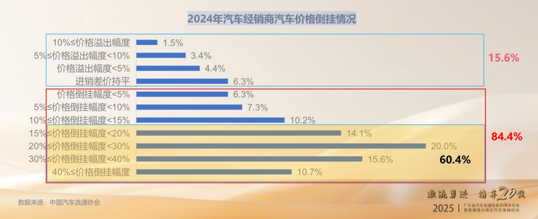 汽車經銷商近兩年的日子確實不好過。此前,中國汽車流通協會副秘書長朗學紅提到,2024 年,有 84.4% 的汽車經銷商有不同程度的價格倒掛,60.4% 的汽車經銷商價格倒掛幅度在 15% 以上。雖然,當年汽車經銷商虧損面較 2023 年有所收窄,但僅有 39.3% 經銷商盈利。虧損經銷商占比為 41.7%,持平占比為 19.0% 。