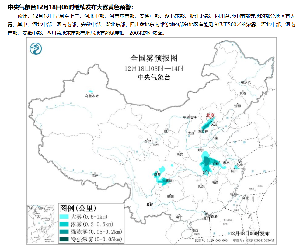 預計,12月18日早晨至上午,河北中部、河南東南部、安徽中部、湖北東部、浙江北部、四川盆地中南部等地的部分地區有大霧,其中,河北中部、河南南部、安徽中部、湖北東部、四川盆地東南部等地的部分地區有能見度低于500米的濃霧,河北中部、河南南部、安徽中部、四川盆地東南部等地局地有能見度低于200米的強濃霧。