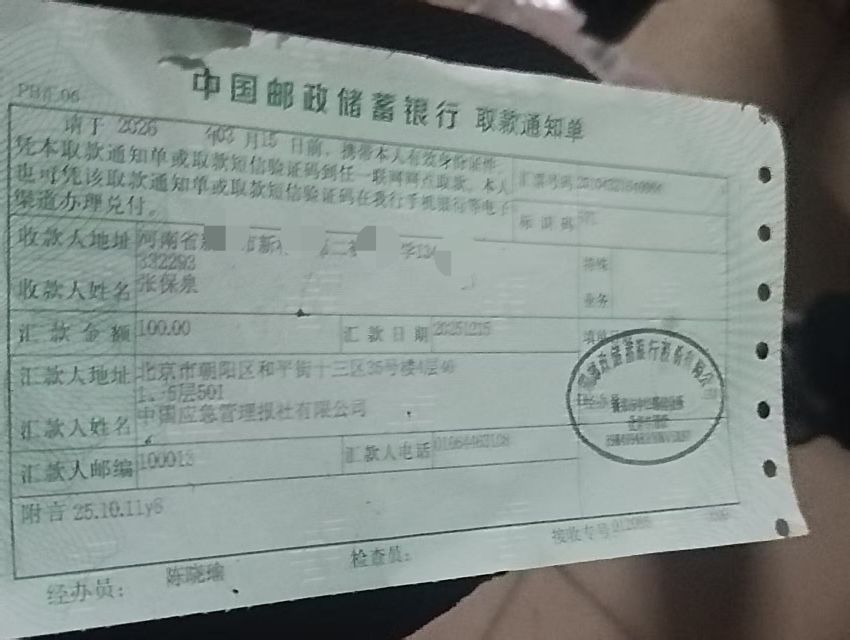 昨天下午,母親給我發(fā)了一張圖片。點(diǎn)開(kāi)一看,是《中國(guó)應(yīng)急管理報(bào)》10月份的稿費(fèi)單,100大洋。那張綠色的匯款單,讓我的心情為之振奮。同時(shí)又在心里默默地為這家報(bào)社點(diǎn)了100個(gè)贊。