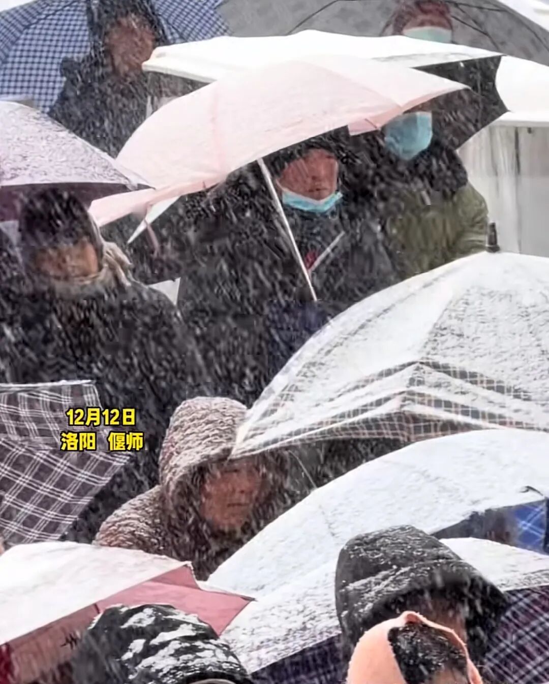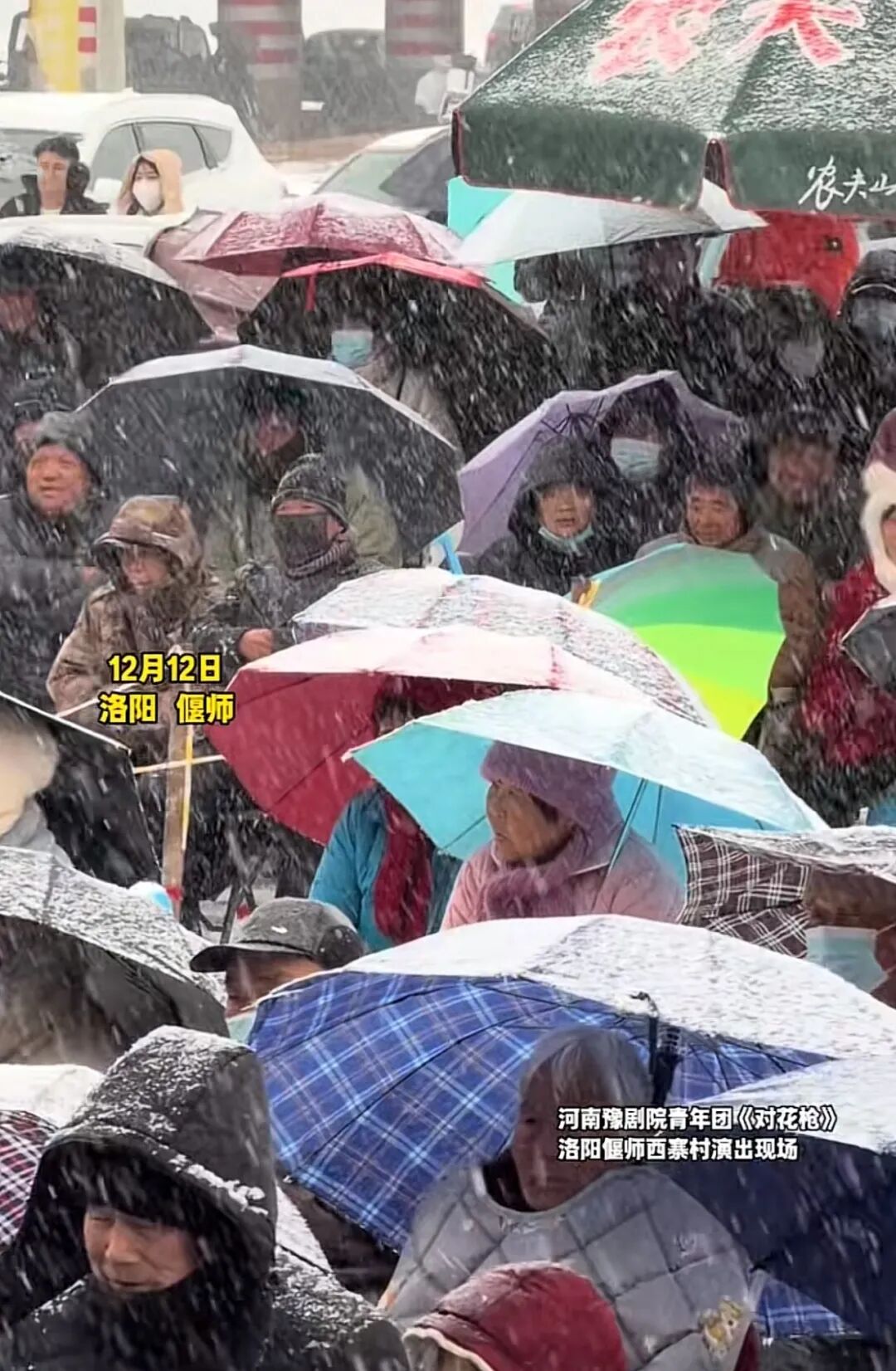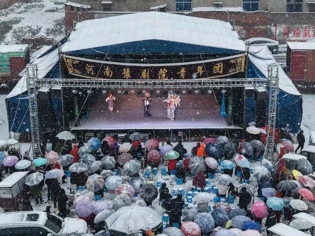 12月12日,河南洛陽市偃師區大口鎮西寨村,大雪紛飛,河南豫劇院青年團的演員仍在專注表演。觀眾撐著傘守在戲臺前——“戲沒停,咱咋能走?”