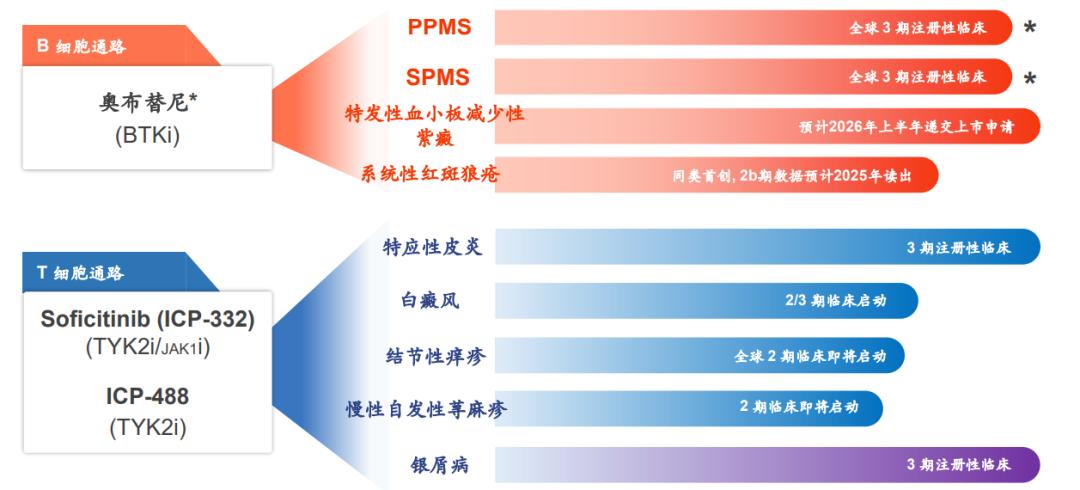 作為國內首個進軍自免領域的BTK抑制劑,奧布替尼的多維突破成為核心看點:在SLE領域,其IIb期臨床研究達成關鍵里程碑,成為全球首個在該適應癥II期試驗中展示顯著療效的BTK抑制劑;在多發性硬化癥(MS)領域,奧布替尼針對原發進展型(PPMS)和繼發進展型(SPMS)的全球多中心III期研究正穩步推進;在ITP領域,其III期注冊臨床已完成研究,預計2026年上半年即可提交NDA上市申請。