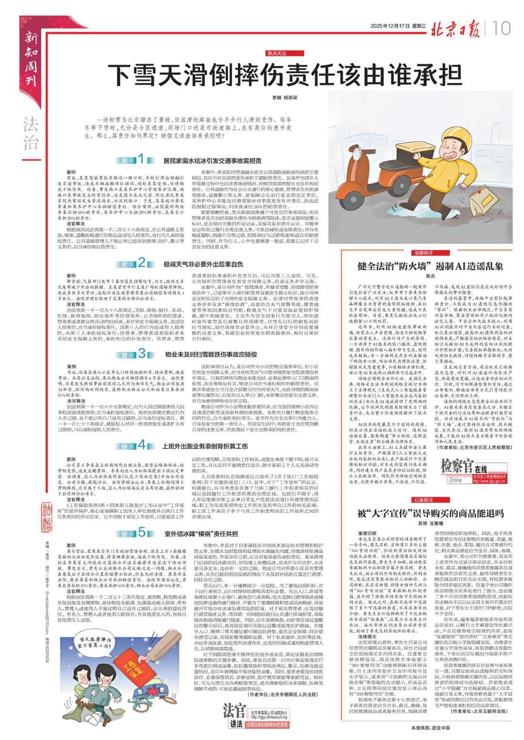 一場(chǎng)初雪為北京增添了景致,但濕滑的路面也令不少行人滑倒受傷。每年冬季下雪時(shí),無(wú)論是小區(qū)通道、商場(chǎng)門(mén)口還是市政道路上,總有類似的意外發(fā)生。那么,其責(zé)任如何界定?賠償又該由誰(shuí)來(lái)承擔(dān)呢?