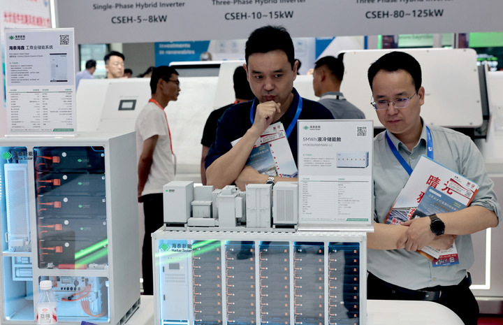6月12日,第十八屆國際太陽能光伏和智慧能源&儲能及電池技術(shù)與裝備(上海)展覽會在國家會展中心(上海)舉行。圖為參觀者在一組儲能設(shè)備模型展品前駐足觀看。(新華社)