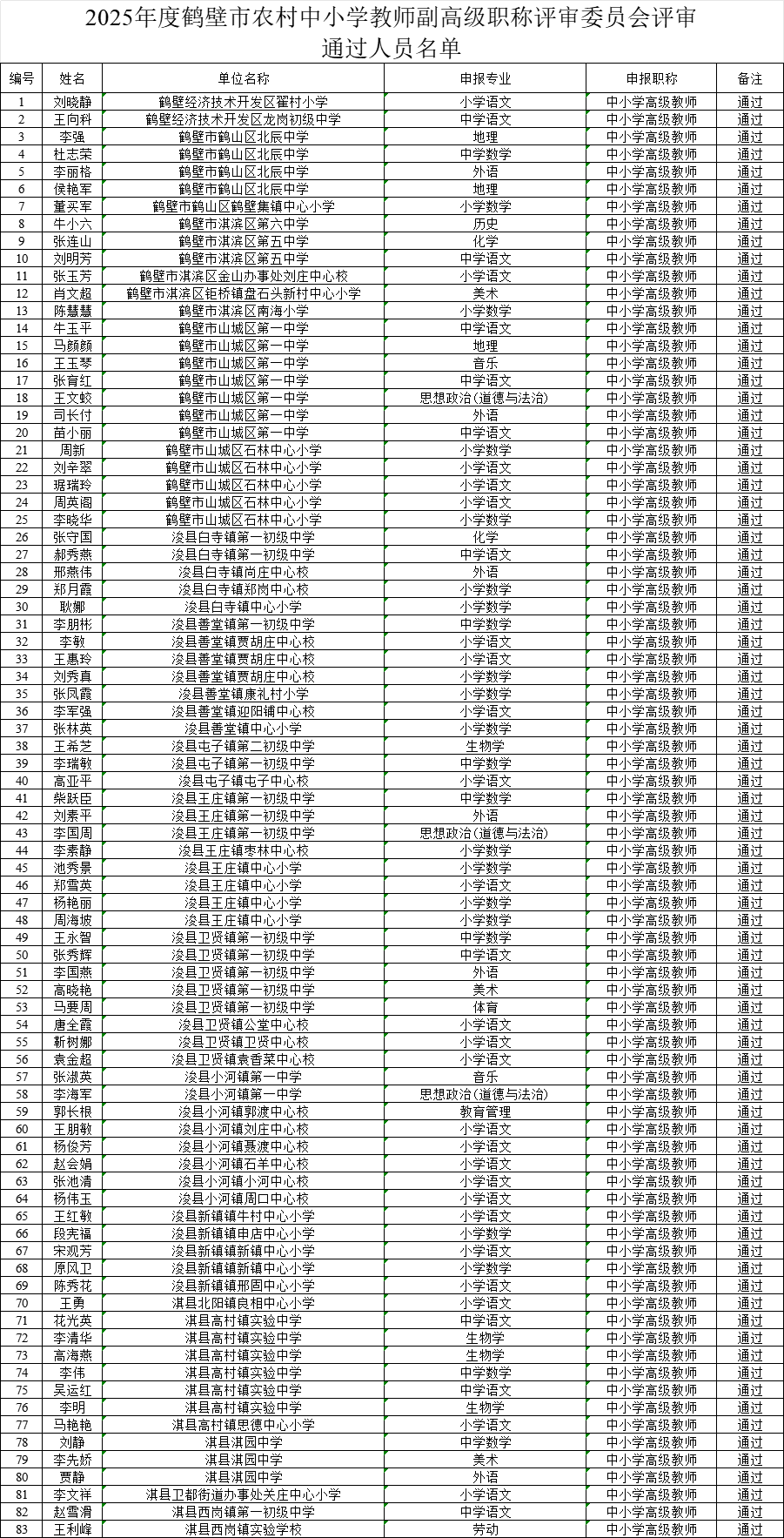 2025年度鶴壁市農村中小學教師副高級職稱評審委員會評審通過人員名單