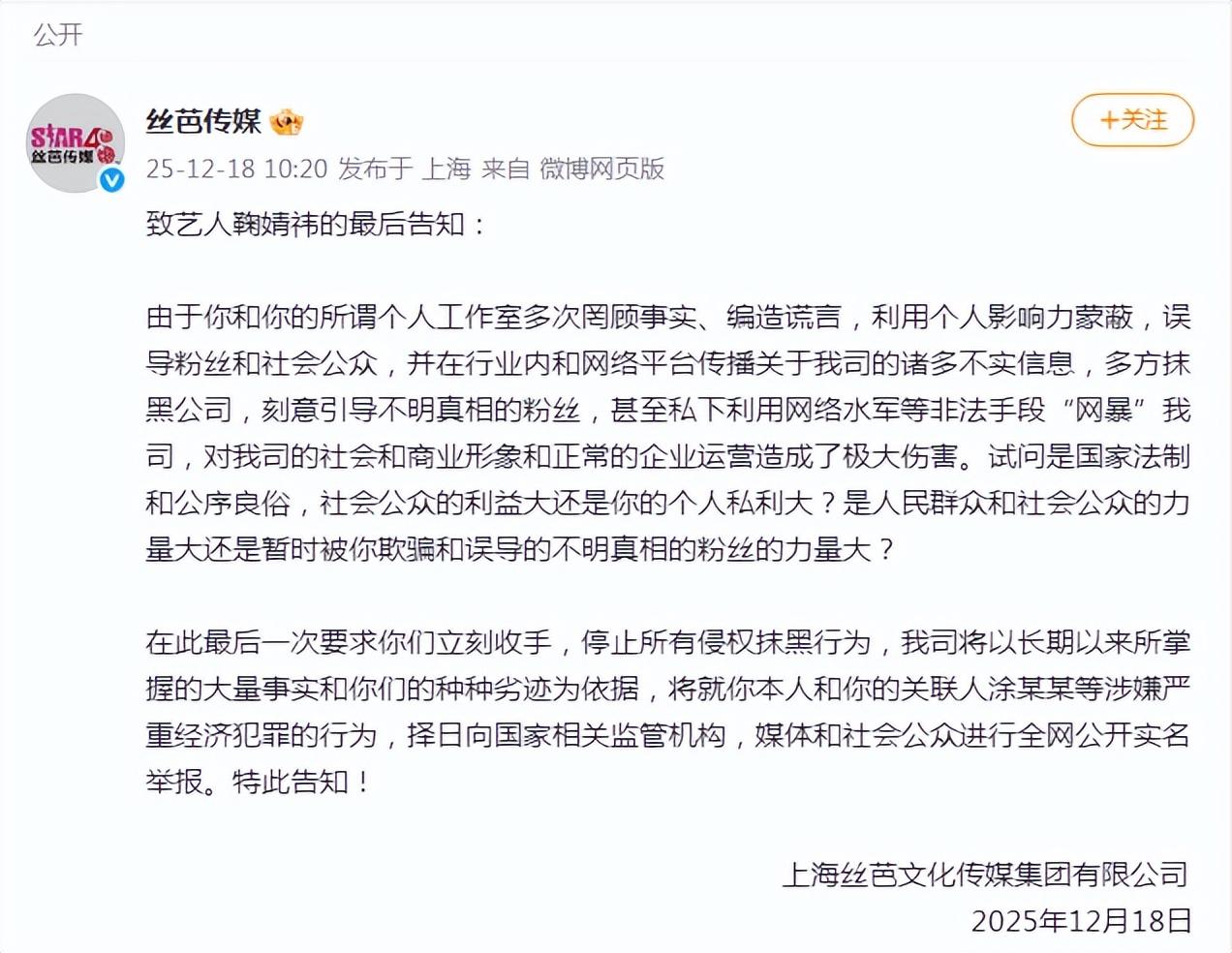 12月18日,絲芭傳媒發(fā)布《致藝人鞠婧祎的最后告知》,主要內(nèi)容包括要求其停止侵權(quán)抹黑、將向相關(guān)監(jiān)管機(jī)構(gòu)舉報(bào)對(duì)方涉嫌經(jīng)濟(jì)犯罪行為等。