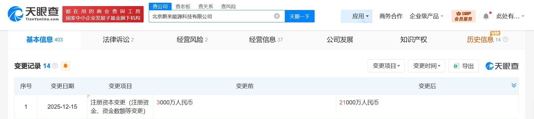 雷達財經(jīng)訊,天眼查App顯示,近日,北京蔚來能源科技有限公司發(fā)生工商變更,注冊資本由3000萬人民幣增至2.1億人民幣,增幅600%。