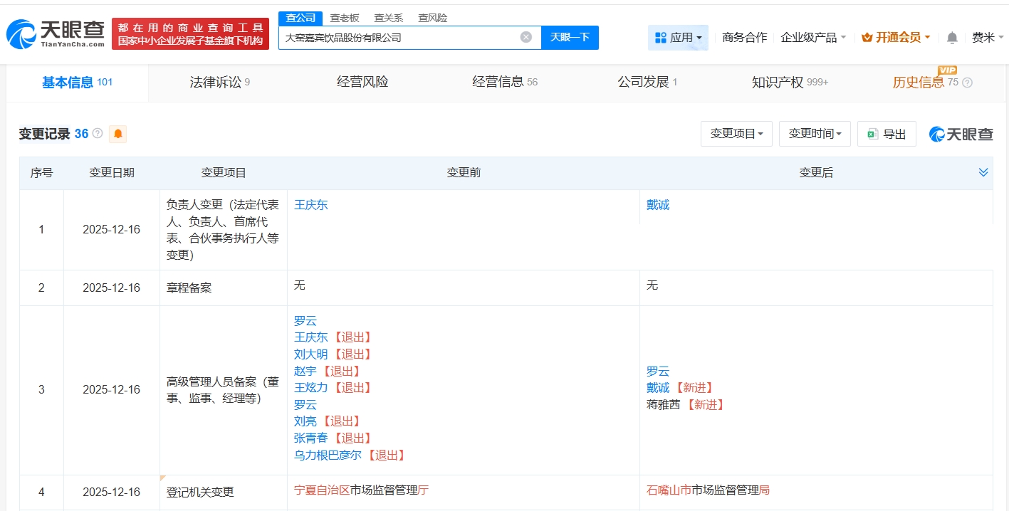 雷達(dá)財(cái)經(jīng)訊,天眼查App顯示,近日,大窯嘉賓飲品股份有限公司發(fā)生工商變更,大窯汽水創(chuàng)始人王慶東卸任該公司法定代表人、董事長(zhǎng),戴誠(chéng)接任法定代表人并擔(dān)任董事,同時(shí),多位高管發(fā)生變更。