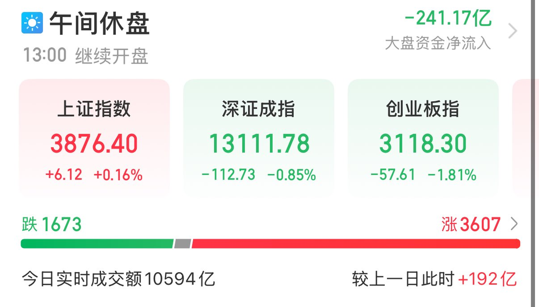 截至午盤,上證指數漲0.16%,深證成指跌0.85%,創業板指跌1.81%,北證50漲0.64%。全市場成交額10592億元,較上日成交額放量190億元。