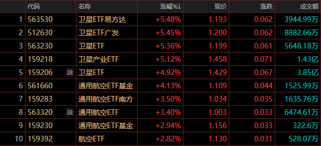 ETF午間收盤漲跌不一,衛星ETF易方達(563530)領漲5.48%,衛星ETF廣發(512630)漲5.45%,衛星ETF(563230)漲5.36%。