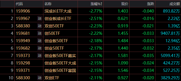 深成長ETF大成(159906)領跌2.77%,創業板成長ETF(159967)跌2.51%,雙創50ETF(588380)跌2.23%。