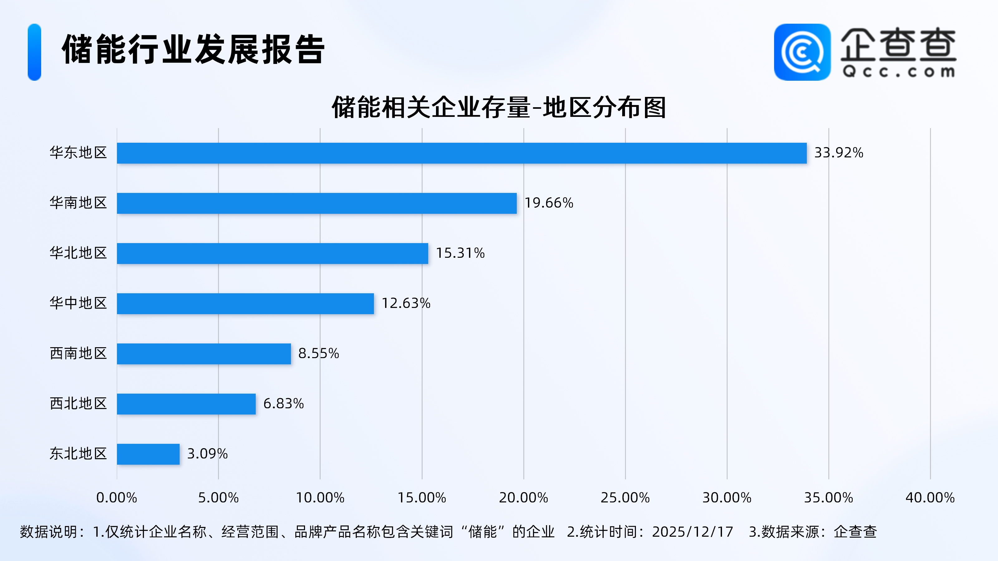 企查查數據顯示,從地區分布來看,儲能相關現存企業多分布在華東地區,占比達33.92%。其次,分布在華南地區、華北地區的儲能相關企業分別占比19.66%、15.31%。