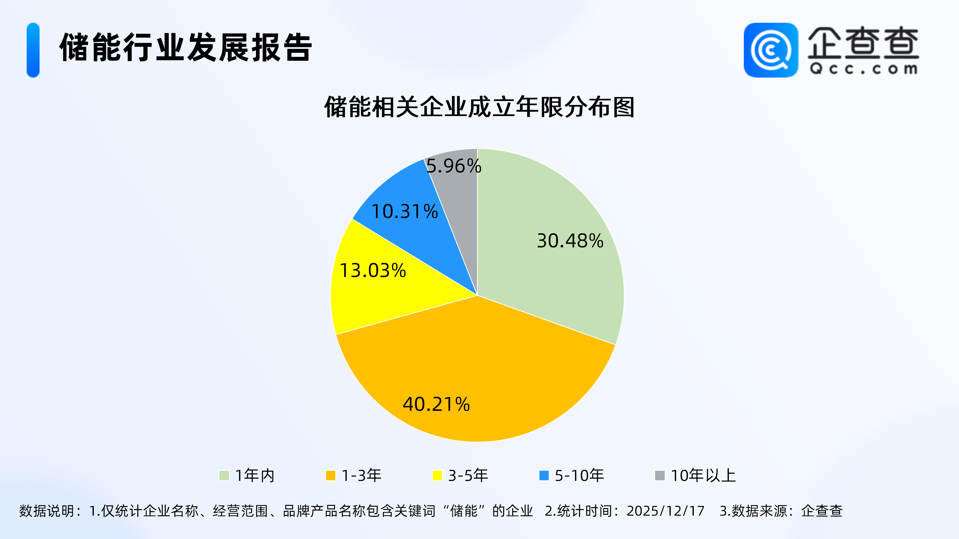 企查查數據顯示,從經營時間來看,儲能相關現存企業多成立于近三年,其中,成立年限在1-3年的相關企業最多,占比40.21%。成立年限在1年內的相關企業占比30.48%。