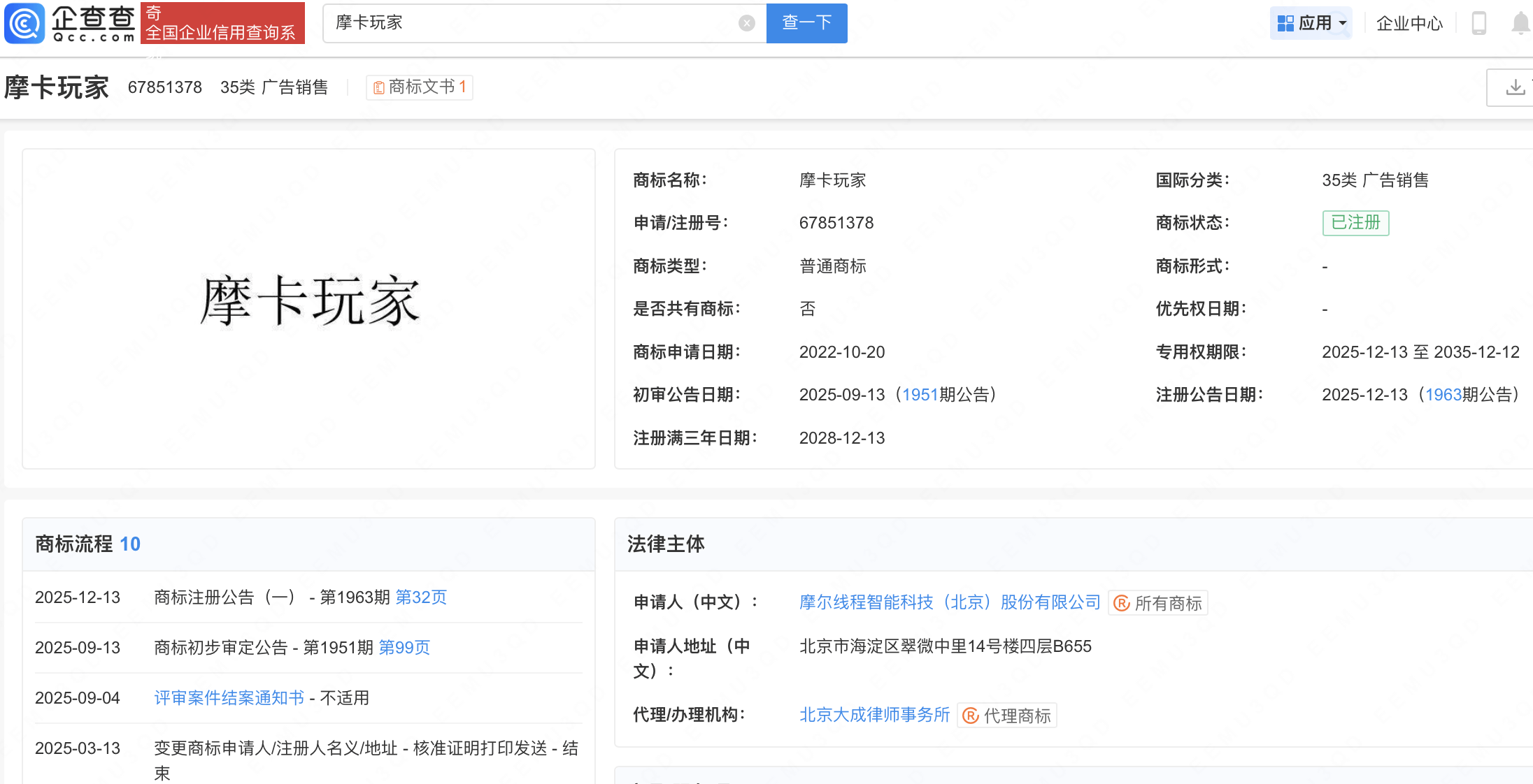 企查查APP顯示,近日,摩爾線程(688795)成功注冊(cè)1枚“摩卡玩家”商標(biāo),國(guó)際分類為廣告銷售。公開信息顯示,摩卡玩家是摩爾線程顯卡用戶的一個(gè)社交平臺(tái),專注于分享產(chǎn)品體驗(yàn)和游戲樂趣。