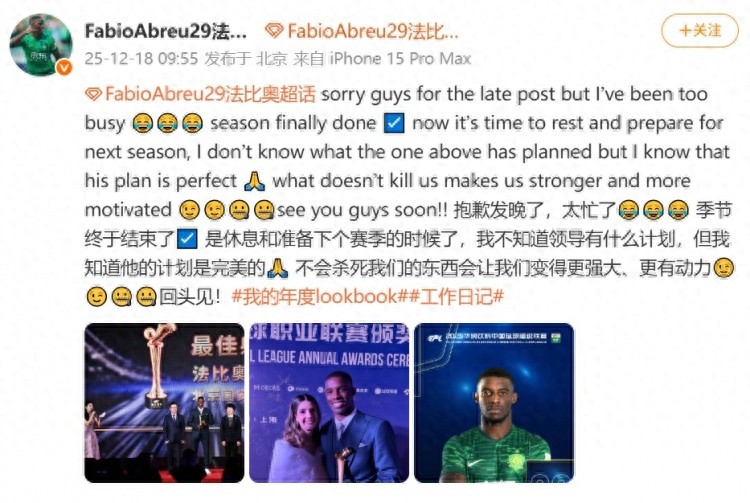 12月18日訊 在個(gè)人社媒,國(guó)安前鋒法比奧總結(jié)2025賽季。
