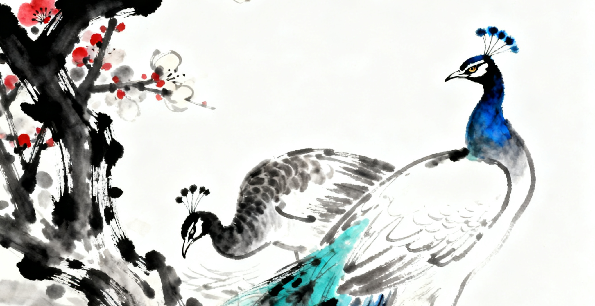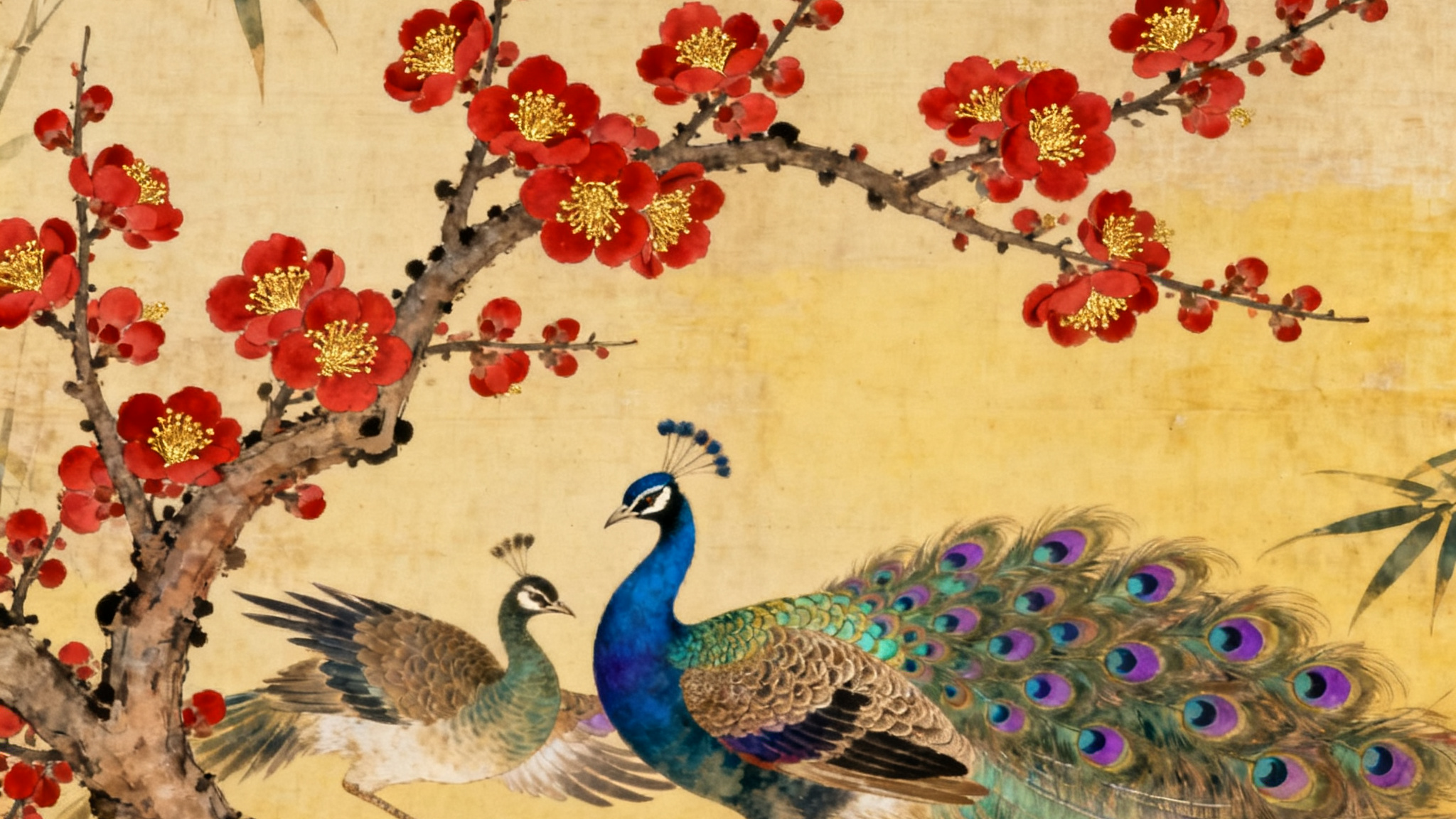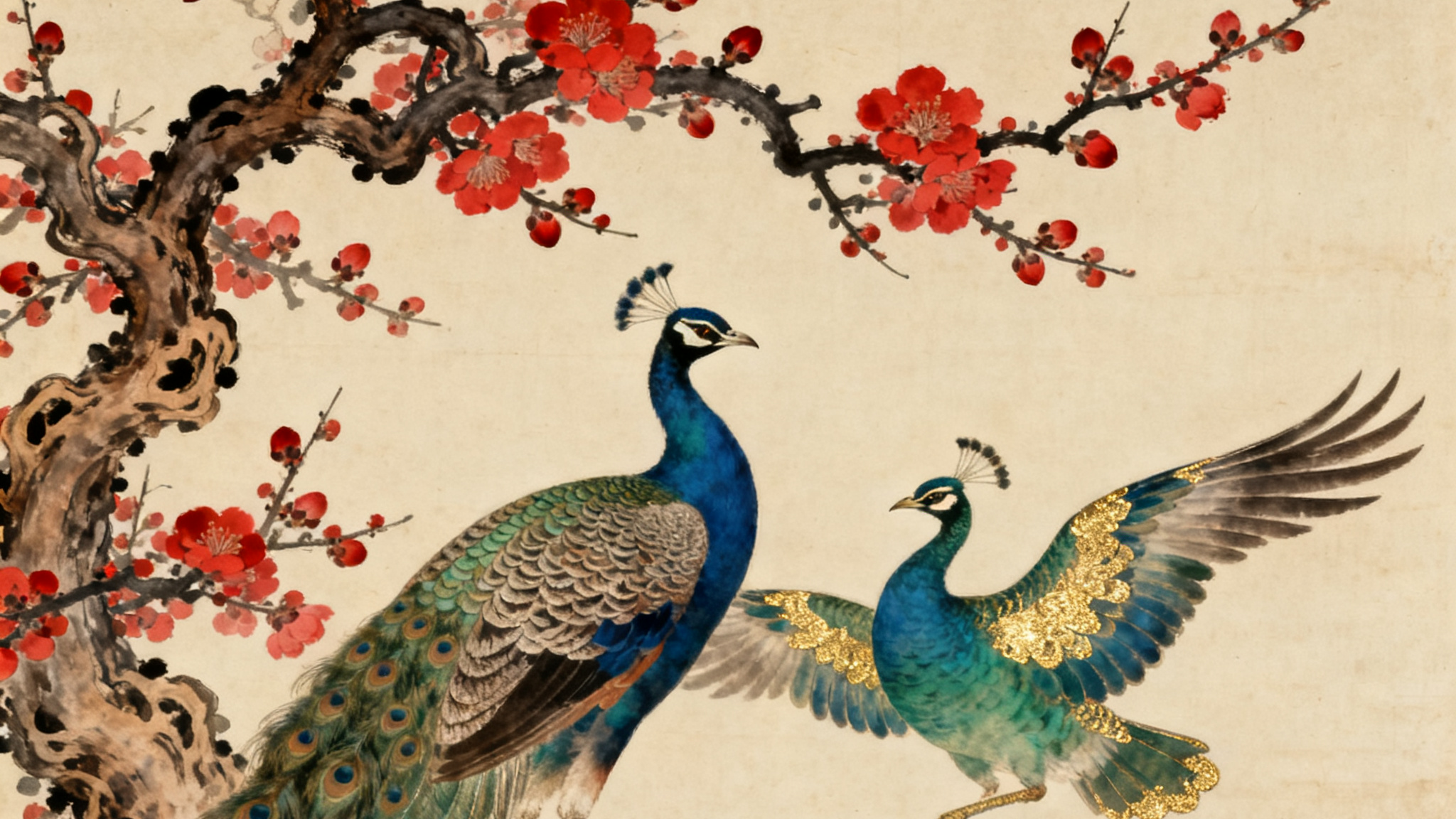 紅梅樹是畫面中的另一個重要元素。紅梅綻放,嬌艷欲滴的花朵與翠綠的枝葉相互映襯,為畫面增添了一抹生機與艷麗。梅花的花瓣以細膩的粉色暈染而成,仿佛還帶著清晨的露珠,散發(fā)著淡淡的清香。枝干則用蒼勁有力的筆觸勾勒,展現(xiàn)出梅花傲霜斗雪的堅韌品質(zhì)。紅梅與孔雀的搭配相得益彰,既體現(xiàn)了自然的和諧之美,又寓意著吉祥與美好。