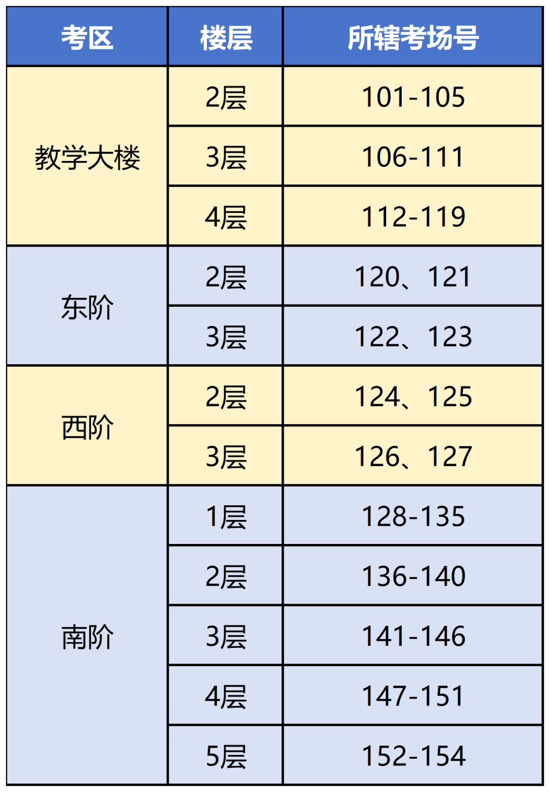 考場分布在教學大樓、東西階、南階,為節(jié)約時間,防止物品存取排隊擁擠及通過安檢通道堵塞,請各位考生根據個人屬性及所屬考場分布,務必按指定路線進場。