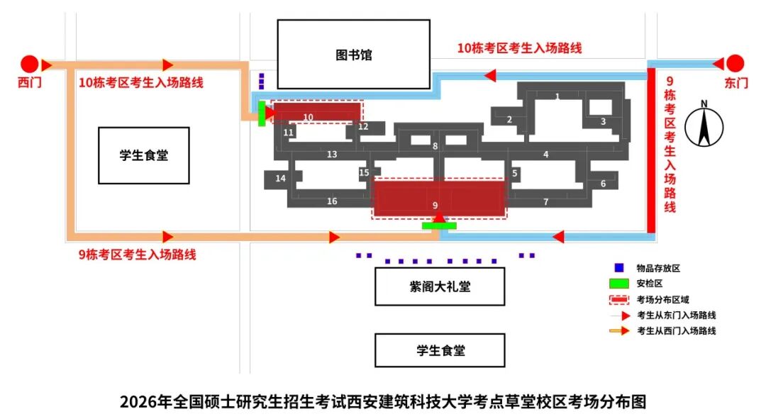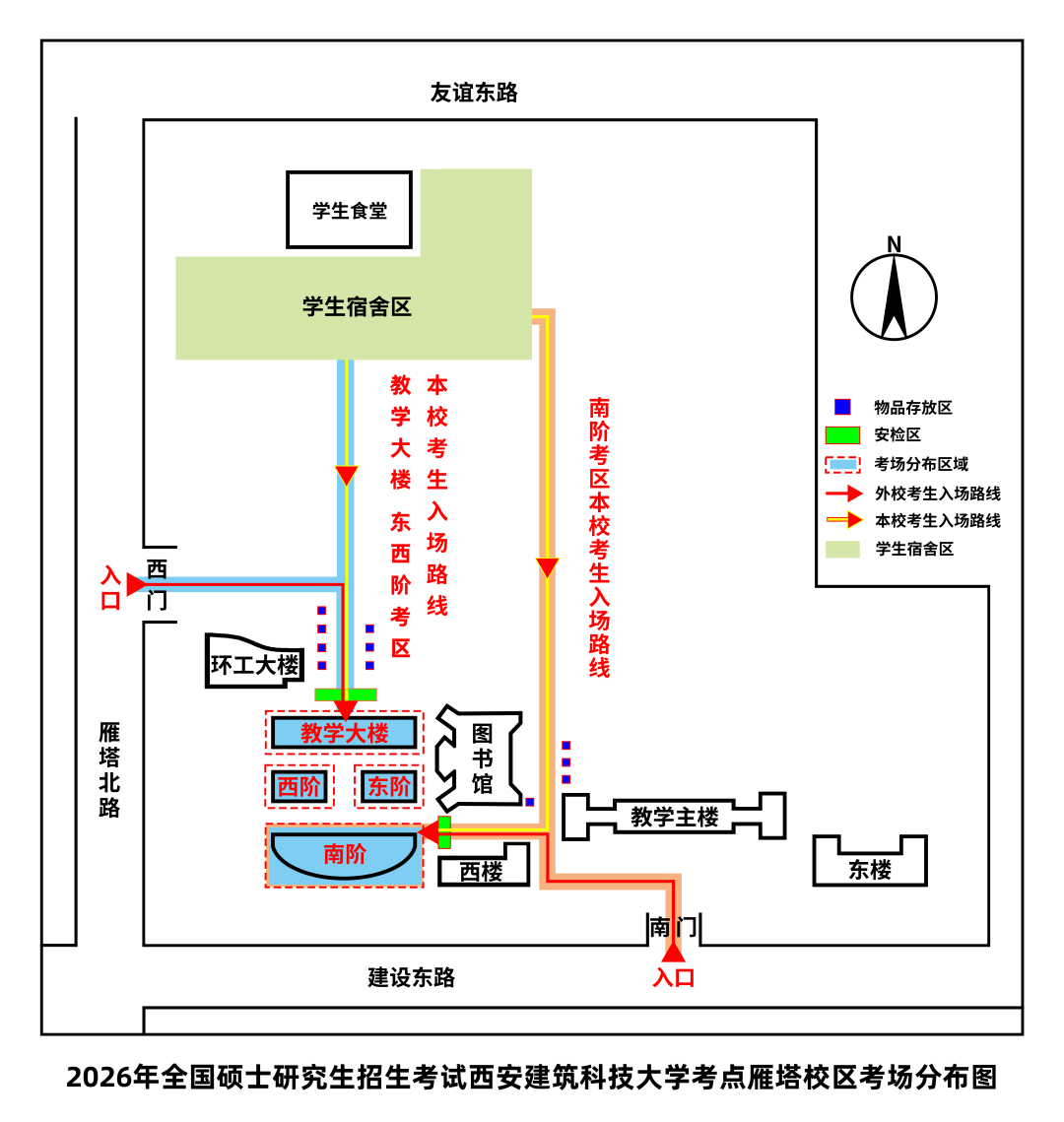 (1)考場分布在教學大樓、東西階的校外考生:從學校西門(雁塔北路),憑準考證進入校園,在教學大樓北側存取物品,之后從教學大樓前安檢通道進入考區(qū)。
