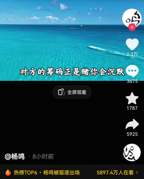 楊鳴在深夜凌晨兩點多,通過社媒發布視頻,自然是對于被驅逐的回應:“你必須學會回擊每一個不尊重你的人,遭遇欺壓時不必害怕將事態擴大,對方的籌碼正是賭你會沉默。沉默換不來理解,只能換來得寸進尺,你越是沒脾氣,別人越會對你苛刻,一次堅定的反擊,就會有八成的幾率會被尊重。”