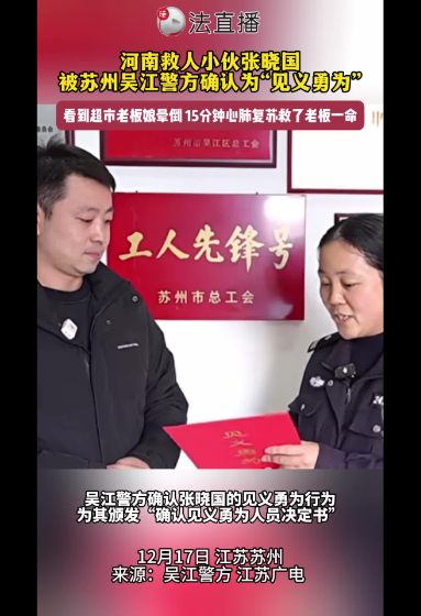 河南救人小伙張曉國被蘇州吳江警方確認為“見義勇為”