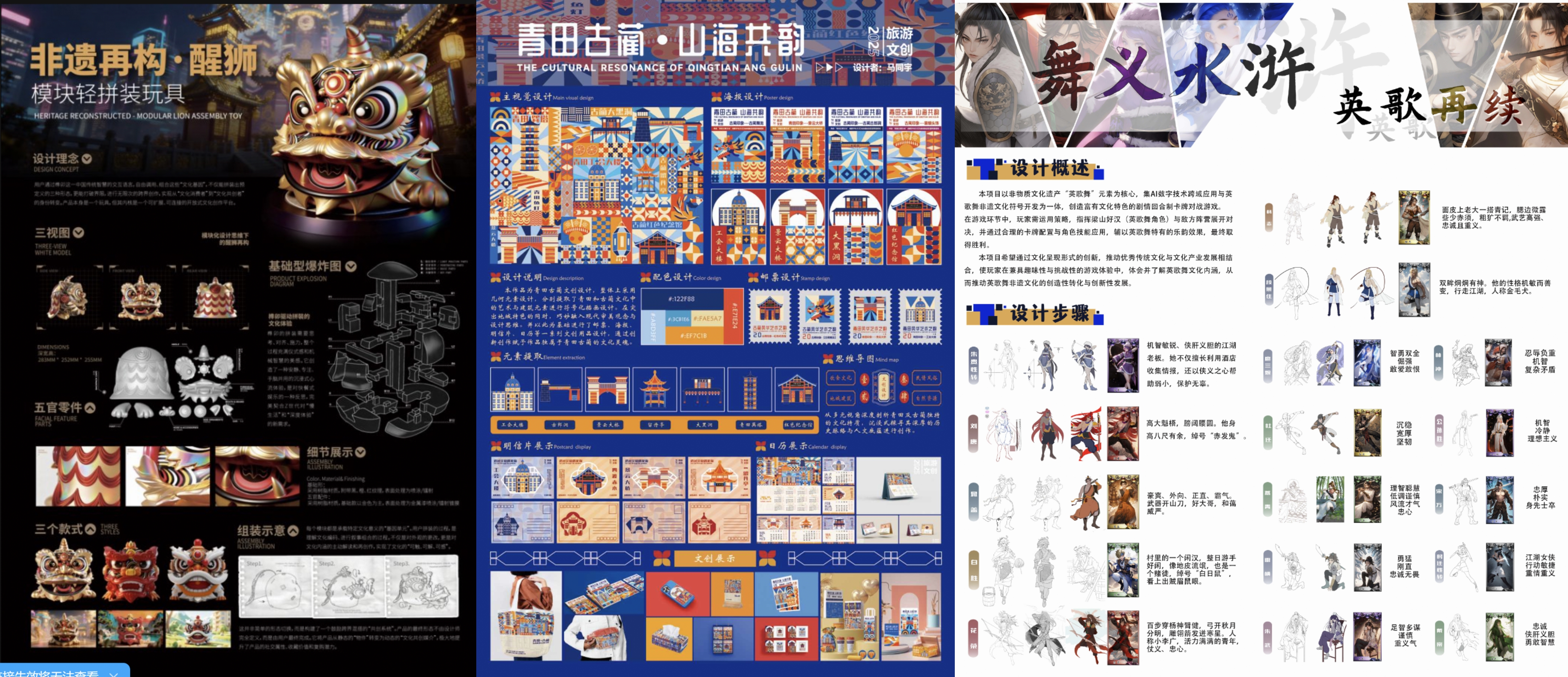 參賽團(tuán)隊(duì)圍繞非遺的數(shù)字化表達(dá)方式、交互體驗(yàn)設(shè)計(jì)以及青少年參與機(jī)制等內(nèi)容進(jìn)行集中呈現(xiàn),強(qiáng)調(diào)作品可落地、可復(fù)制、可推廣,推動(dòng)形成面向社會(huì)化保護(hù)的可持續(xù)方案進(jìn)一步展現(xiàn)科技與文化深度融合的實(shí)踐圖景。各項(xiàng)目集中展現(xiàn)出非遺數(shù)智化從“創(chuàng)意表達(dá)”走向“項(xiàng)目落地”的鮮明趨勢(shì)。如《潮舞承新——基于AIGC賦能的普寧英歌舞非遺創(chuàng)新實(shí)踐》依托AIGC生成英歌舞角色體系,并落地開(kāi)發(fā)主題卡牌游戲《舞義水滸·英歌再續(xù)》與潮玩文創(chuàng)系列《英魂覺(jué)醒》,形成“內(nèi)容IP—產(chǎn)品開(kāi)發(fā)—傳播運(yùn)營(yíng)”的轉(zhuǎn)化鏈條。項(xiàng)目推動(dòng)莞揭兩地合作,并與普寧富美青年英歌隊(duì)建立對(duì)接機(jī)制,以賽事成果與產(chǎn)業(yè)協(xié)同提升英歌文化的創(chuàng)新傳播與可持續(xù)轉(zhuǎn)化能力;《通海高臺(tái)2066》以國(guó)家級(jí)非遺“通海高臺(tái)”為核心,打造沉浸式VR交互表演裝置,將傳統(tǒng)儀式置入“2066”未來(lái)情境,通過(guò)“人/神/機(jī)器”多身份敘事與交互機(jī)制增強(qiáng)觀眾參與度,實(shí)現(xiàn)非遺從“觀看”向“體驗(yàn)”的轉(zhuǎn)譯。作品面向文旅展演、沉浸式體驗(yàn)空間與高校數(shù)字藝術(shù)教學(xué)等場(chǎng)景,已在海外及國(guó)內(nèi)多地展出并獲得關(guān)注,并計(jì)劃于 2026 年在云南通海落地科技文旅項(xiàng)目。《Knotopia》以醒獅為主題,將造型拆解為可拼裝的榫卯模塊,把非遺轉(zhuǎn)化為可操作、可互動(dòng)的潮玩產(chǎn)品,適用于中小學(xué)非遺教育的趣味性動(dòng)手動(dòng)腦特點(diǎn),等等。參賽作品分別從AIGC內(nèi)容生產(chǎn)與文創(chuàng)開(kāi)發(fā)、沉浸式文旅展演落地、模塊化產(chǎn)品與產(chǎn)業(yè)協(xié)作等維度,給出可實(shí)施的技術(shù)方案與應(yīng)用場(chǎng)景,為非遺的社會(huì)化傳播、教育轉(zhuǎn)化與產(chǎn)業(yè)轉(zhuǎn)譯提供了可復(fù)制的實(shí)踐樣本。