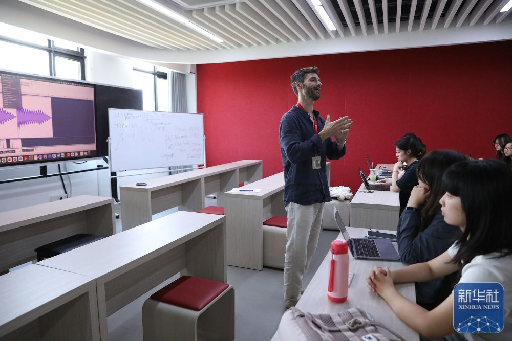 中央民族大學海南國際學院的外籍教師在給學生上音樂技術與作曲課。