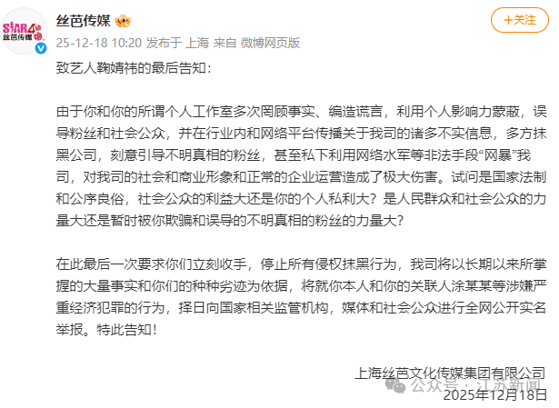 12月18日,絲芭傳媒發布致藝人鞠婧祎的最后告知: