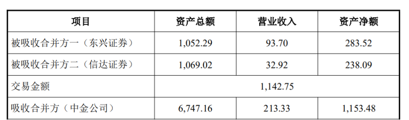 公告顯示,2024年,中金公司、東興證券、信達證券營業收入分別為213.33億元、93.70億元、32.92億元,此次交易金額為1142.75億元。