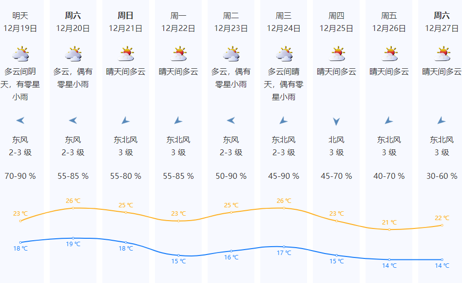 19-20日陰天間多云,有間歇性小雨,日溫差減小;