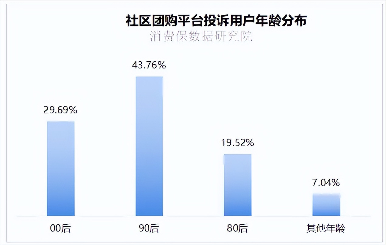 在社區團購平臺投訴用戶中,女性占比66.10%,男性占比33.90%。從年齡結構看,90后是投訴的核心群體,占比達43.76%;其次是00后,占比29.69%;這兩個年輕群體合計占比超七成。整體呈現“年輕群體為主、女性用戶更集中”的特征,與社區團購的主流消費人群畫像基本一致。