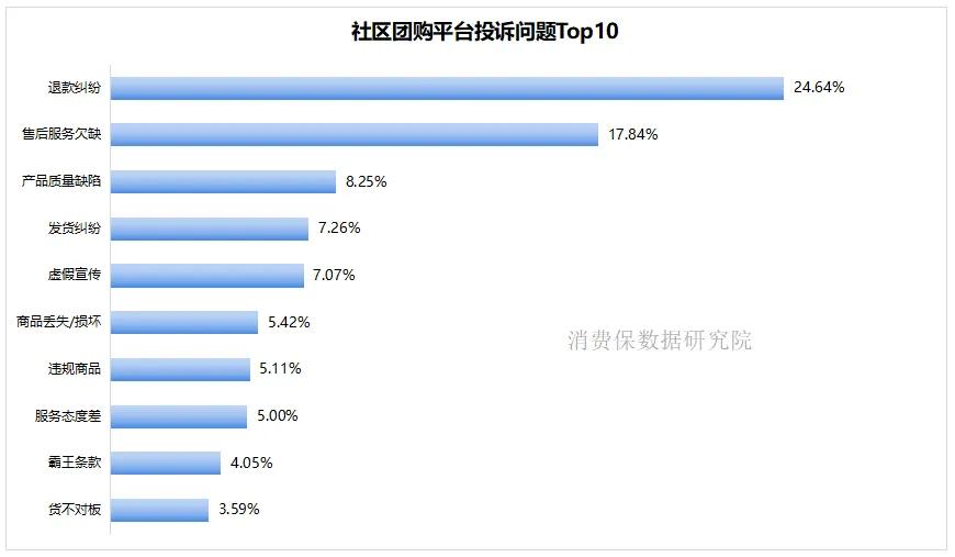 社區團購平臺投訴問題的核心矛盾集中在交易與服務相關維度:退款糾紛以24.64%的占比位居榜首,是消費者反饋最集中的痛點;售后服務欠缺(17.84%)緊隨其后;此外,產品質量缺陷(8.25%)、發貨糾紛(7.26%)的占比也相對突出,整體反映出交易履約與服務保障能力不足是投訴高發的主要誘因。