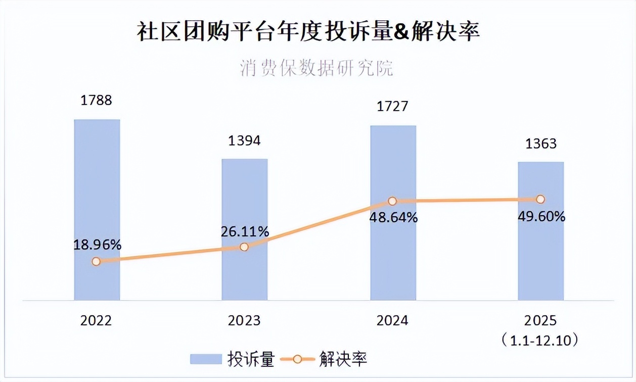 根據消費保平臺社區團購平臺投訴分析報告,2022年1月1日至2025年12月15日,消費保平臺累計受理社區團購平臺相關投訴共6272件,涉訴總金額達459.77萬元,有效投訴的實際解決率為35.38%。這一周期內,2022年投訴量居首(1788件),后續投訴量雖有波動,但平臺解決率呈現逐年上升的趨勢。