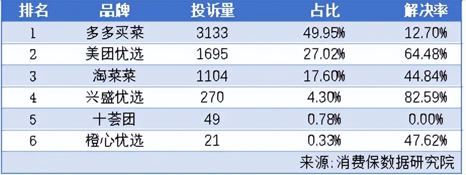 社區團購平臺相關投訴中,多多買菜以3133件投訴量位居榜首,投訴解決率為12.70%;美團優選以1695件投訴位列第二,投訴解決率為64.48%;淘菜菜以1104件投訴排在第三位,投訴解決率為44.84%。