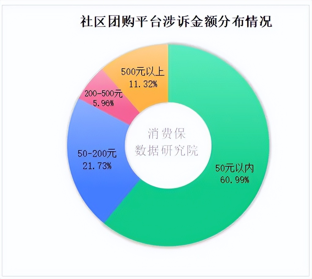 從社區團購平臺涉訴金額分布情況來看,50元以內是涉訴金額最集中的部分,占比高達60.99%,整體呈現“小額為主、大額占比少”的特征,契合社區團購高頻小額的消費屬性。