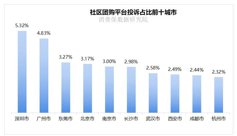 社區團購平臺投訴用戶的地域分布中,深圳市以5.32%的占比位居首位,廣州市(4.83%)緊隨其后,東莞市(3.27%)、北京市(3.17%)分別位列第三、第四。從城市分布來看,投訴占比靠前的城市多集中在珠三角地區(深圳、廣州、東莞),反映出社區團購在人口密集的珠三角區域滲透度較高,對應的消費糾紛也相對集中。
