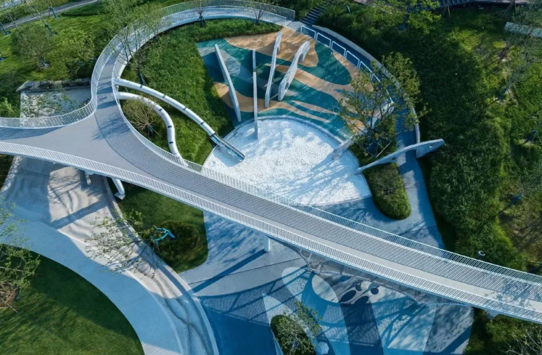 這是現場:斥巨資改造完成的約73000㎡山體公園,登高棧道直通山頂,環形跑道繞山而建。山體南側是約8000㎡運動公園,足球場、籃球場、羽毛球場和網球場,隨時開練。旁邊是約1500㎡兒童樂園,滑板碗池、攀爬區、懸浮大蹦床、超級大草坪、沙坑,孩子們可以暢玩一整天。?