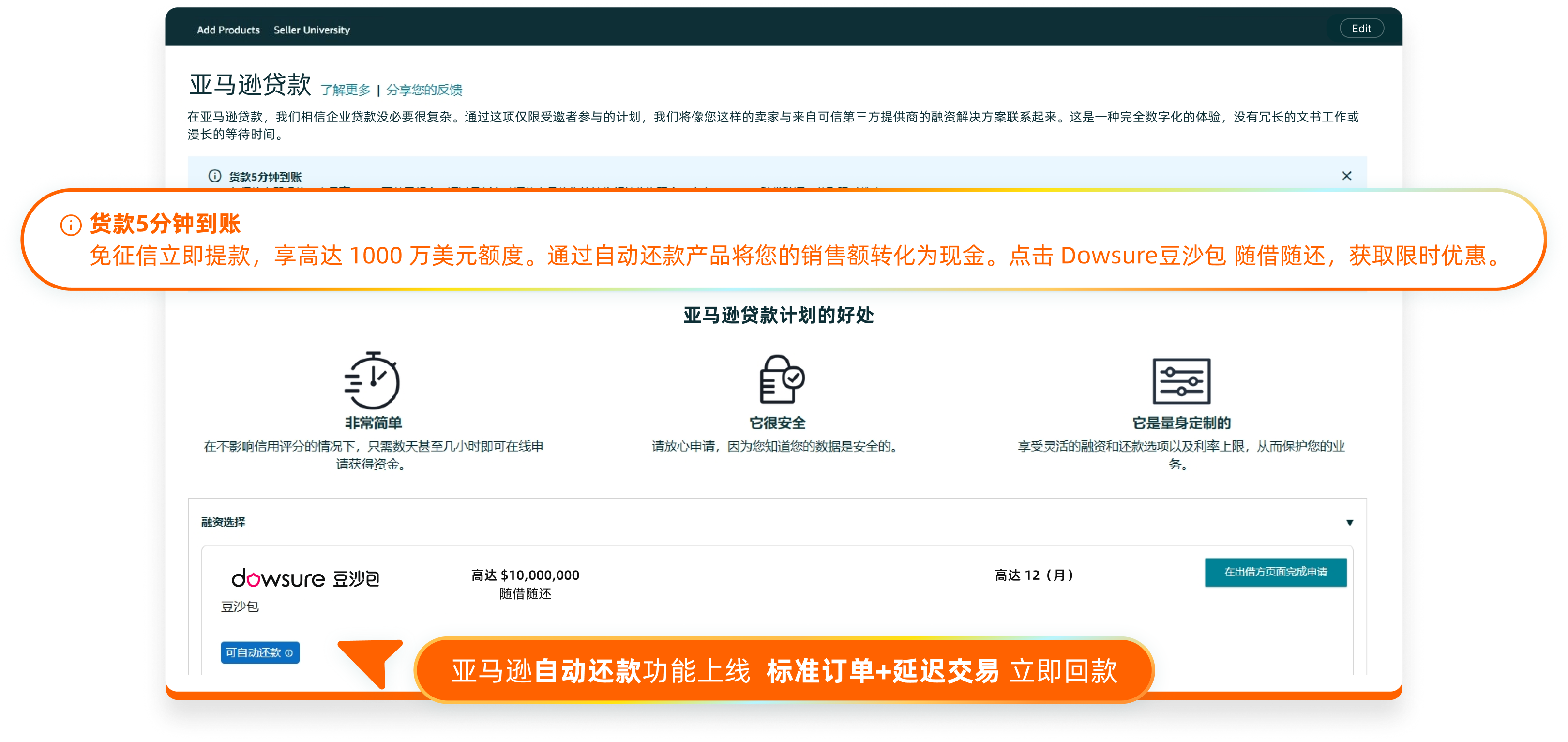 Dowsure豆沙包助力亞馬遜賣家突破資金限制,從 “旺季焦慮” 走向 “穩(wěn)健增長”,真正實(shí)現(xiàn) “跨境生意,資金無憂”。用FastPay極速回款盤活即時現(xiàn)金流,更有Morfund大賣美元貸,單筆最高可貸1000萬美元,且利率比市場同類產(chǎn)品低2% - 4%,為賣家的長遠(yuǎn)發(fā)展提供充足彈藥。