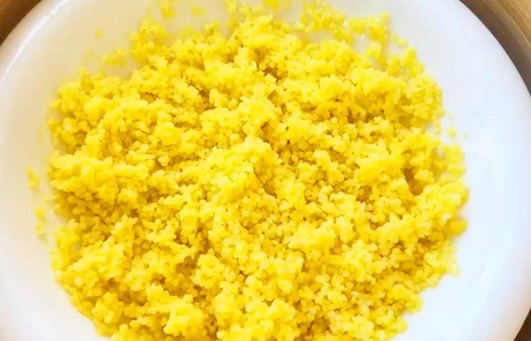 1、小米提前淘洗干凈,放入大碗中,加適量水,上鍋蒸熟后取出,晾至不燙手。小米蒸熟后再加在面團里,比直接用生小米更軟糯,成品口感更好。