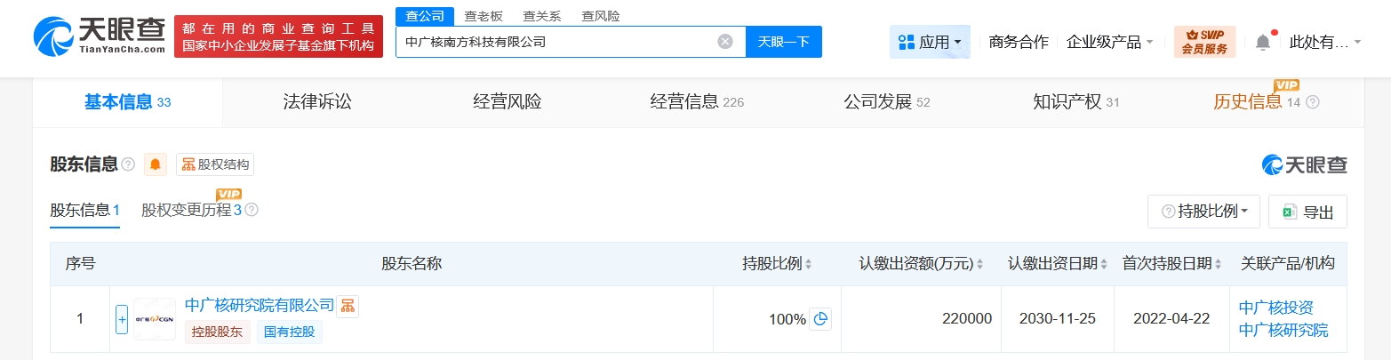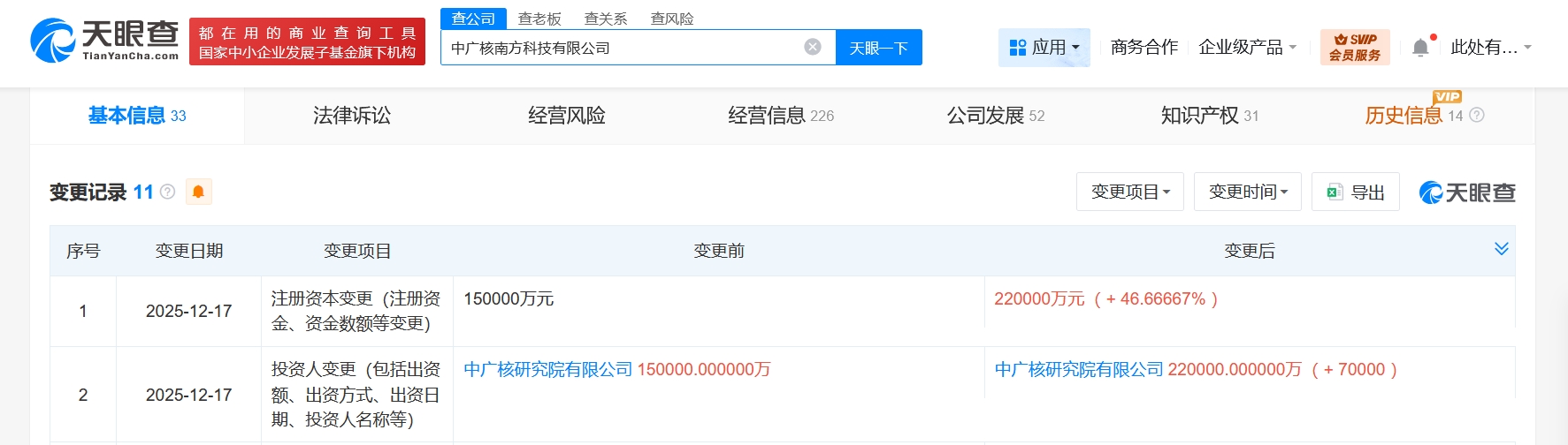 雷達(dá)財(cái)經(jīng)訊,天眼查App顯示,近日,中廣核南方科技有限公司發(fā)生工商變更,注冊資本由15億人民幣增至22億人民幣,增幅約47%。
