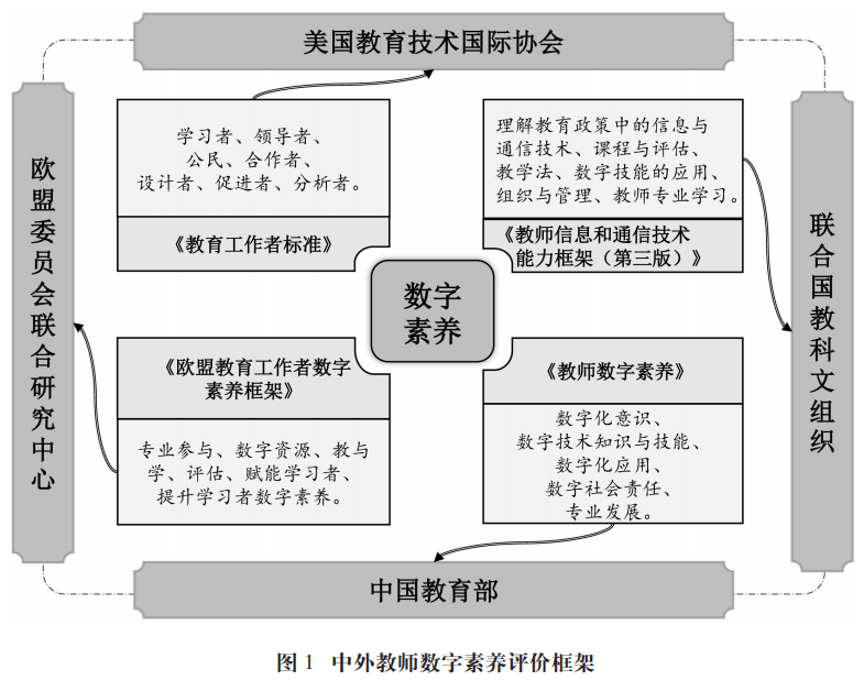為了全面提升公民數字能力,深化數字化教育變革,明確教師數字素養發展方向,近年來歐盟委員會聯合研究中心(Joint Research Centre,JRC)、美國教育技術國際協會(International Society for Technology in Education, ISTE)、聯合國教科文組織(UNESCO)以及我國教育部相繼發布了教師數字素養的評價框架或標準。2017年,在大量調查及研究基礎上,JRC提出了由專業參與、數字資源、教與學、評估、賦能學習者、提升學習者數字素養六個素養域(含22項要素)構成的多維立體化教師數字素養評價體系——《歐盟教育工作者數字素養框架》[11]。同年,ISTE發布新版《教育工作者標準》,對教師角色進行了新的定位,將教師角色分為學習者、領導者、公民、合作者、設計者、促進者、分析者七個維度指標(含24項具體能力)[12]。2018年,UNESCO發布的《教師信息和通信技術能力框架(第三版)》更具有多元文化適用性,涵蓋了理解教育政策中的信息與通信技術、課程與評估、教學法、數字技能的應用、組織與管理、教師專業學習六個維度(含18項能力),對應了教師將信息技術用于教學目的的三個不同階段[13]。《教師數字素養》構建了包含數字化意識、數字技術知識與技能、數字化應用、數字社會責任和專業發展在內的五維三級框架[8],為各級各類教育工作者數字素養評估與發展提供了指導方向。中外教師數字素養評價框架的具體信息見圖1。