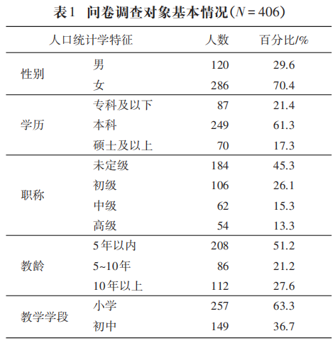 本研究依托2024年教育部“國培計劃”示范性項目、第七屆“農村教育首都論壇”等項目,向教育數字化處于中等水平的B市F區12所鄉村學校教師隨機發放問卷。研究共回收問卷423份,經篩查排除無效樣本,最終獲得有效問卷406份,有效率為95.98%,調查對象基本信息詳見表1。同時,選取15名教師進行半結構化訪談,其中小學教師有9人,包括語文教師3人,數學教師3人,道法教師2人,藝術教師1人;中學教師有6人,包括語文教師1人,數學教師1人,生物教師2人,信息技術教師2人。訪談話題圍繞鄉村中小學教師在提升數字化素養過程中遇到的阻礙展開,并根據回答追問提升教師數字素養相關制度的基層建議。在呈現量化分析結果時,結合訪談資料進行討論、補充、解釋,以確保研究結果的真實可信。