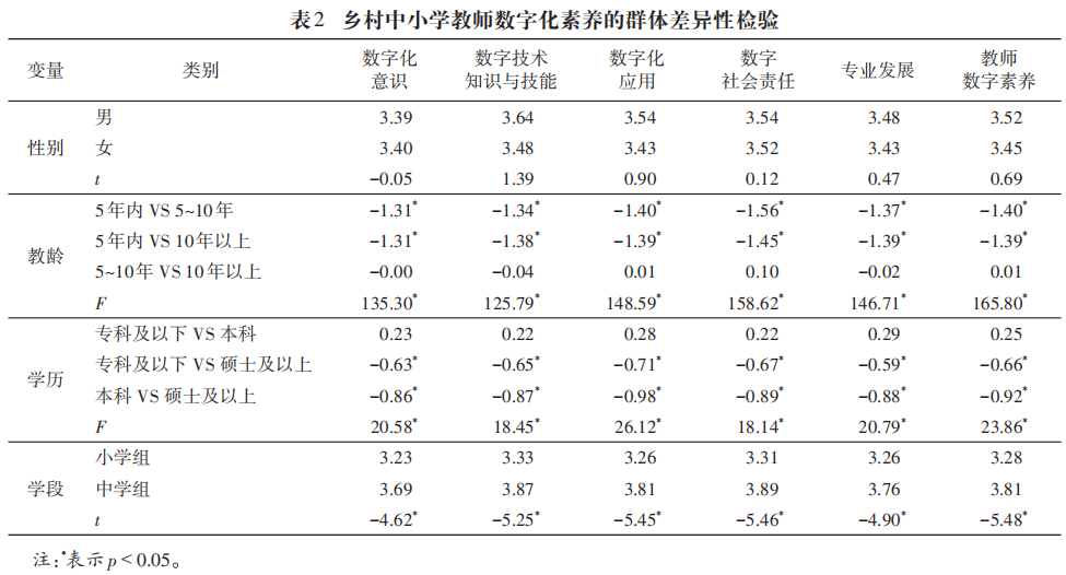 除了對鄉村中小學教師整體數字素養水平進行評價,本研究還進一步分析了鄉村中小學教師數字素養在不同人口學背景上的群體差異。具體而言,研究根據變量的類型,分別采用獨立樣本t檢驗和單因素方差分析法(ANOVA),對性別、教齡、學歷、學段等特征下的鄉村中小學教師數字素養差異進行檢驗,以期為提升教師的數字素養提供更為準確的依據。分析結果如表2所示。