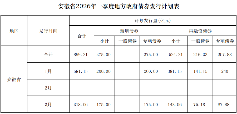 12月18日,安徽省2026年一季度地方政府債券發行計劃表公布,擬發總額為899.21億元,含375億元新增專項債。