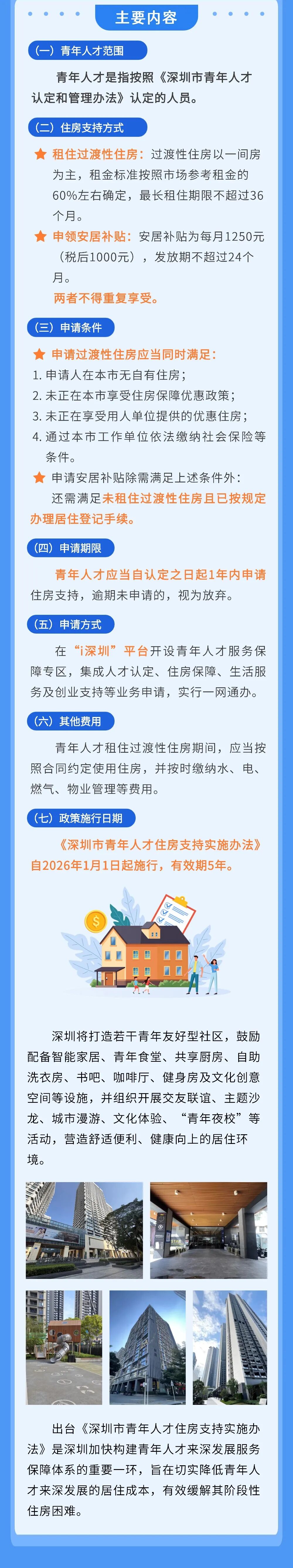 為進一步加強青年人才來深發(fā)展服務保障,打造最好的科技創(chuàng)新生態(tài)和人才發(fā)展環(huán)境,切實解決首次來深青年人才(以下簡稱青年人才)階段性住房困難,深圳正式出臺《深圳市青年人才住房支持實施辦法》,明確了青年人才住房支持的申請條件、過渡性住房和安居補貼支持標準、申請流程、監(jiān)督管理等內容。