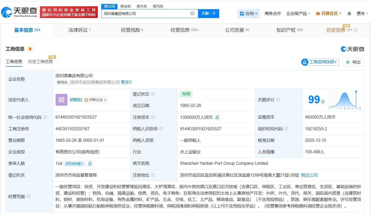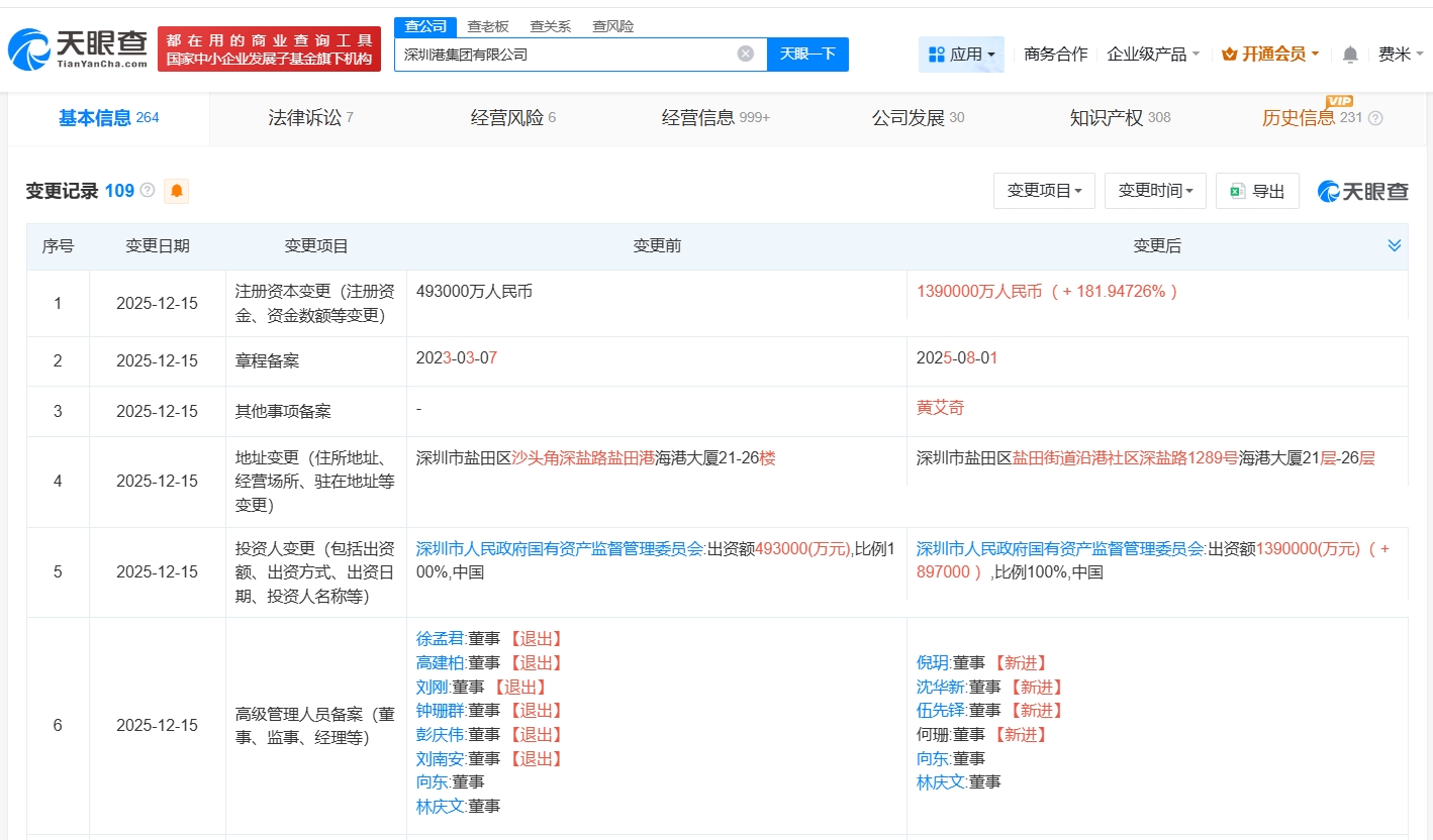 天眼查App顯示,近日,深圳港集團有限公司發生工商變更,注冊資本由49.3億人民幣增至139億人民幣,增幅約182%,同時,多位高管發生變更…