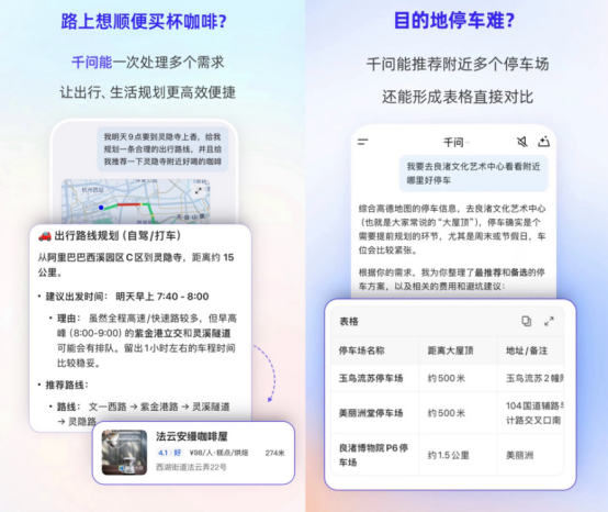 對于復(fù)合任務(wù),它能“順路規(guī)劃”。“明早9點要到靈隱寺上香,給我規(guī)劃一條合理出行路線,并且給我推薦一下靈隱寺附近好喝的咖啡”,針對這種連貫需求,千問基于導(dǎo)航路線,在“順路”約束下篩選店鋪,真正實現(xiàn)了導(dǎo)航與生活服務(wù)的無縫銜接。